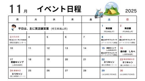 11月は、紅葉のシーズン。キャンプイベントは、キャンプをせずにお買い物だけでもOK。