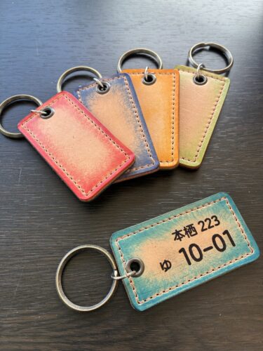 革のナンバープレート風キーホルダー。お好きな文字や数字。大切な言葉をレーザーにて焼印できます。